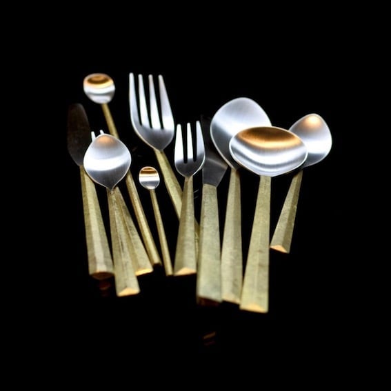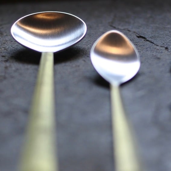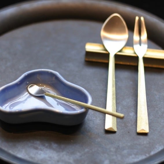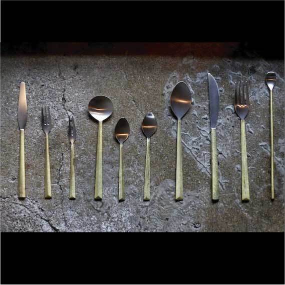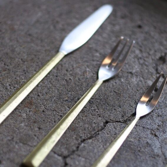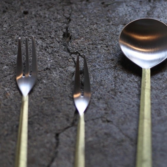 ▲真鍮鋳肌の素材感を生かしたカトラリーシリーズ。口に触れる部分は銀メッキを施してあります。口に触れる先端部分をヘアラインで研磨した後銀メッキで仕上げ。真鍮と銀のコントラストが美しく、手に取ったときの滑らかな鋳肌の手触りや手に収まる重厚感をお楽しみいただけます。