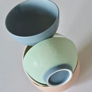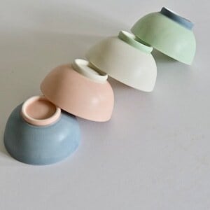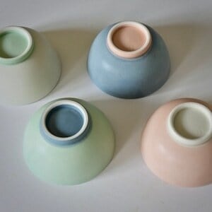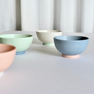 こちらは、こぶりのこども碗。つみきやおもちゃを積んだようで、色の組み合わせがとても楽しいデザインです。水彩絵の具をかけたような優しい色の印象がとても素敵。子どもの飯碗としてのみだけではなく、お客様用のお碗や小鉢としても使用できます。
