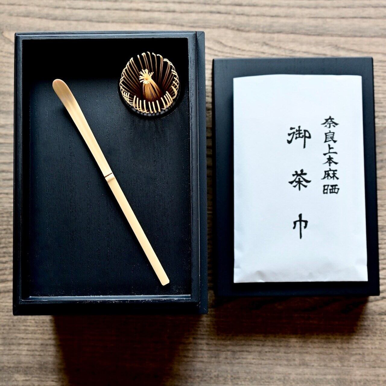 This tea box set contains six utensils crafted by Gato Mikio Shoten, along with a tea whisk (chasen), tea scoop (chashaku), and tea cloth (chakin).