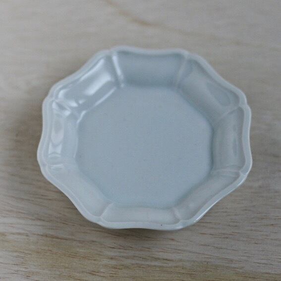 こちらの「九谷の白」は、絵付け前の九谷焼きの器に、傷や気泡が入ってしまったために流通から外れた昭和30年代のものです。ブランド名も何もつかない名もなき器ですが、凛としていてとても美しいフォルムです。こちらのお花のような八角のお皿は、ヨーロピアンな雰囲気漂う優雅なフォルム。白の素材が引き立つ形で、無口ながらも華やかな印象。小皿は醤油などに。中皿は取り皿に。【サイズ】中皿 直径:13cm 小皿 直径: 11cm