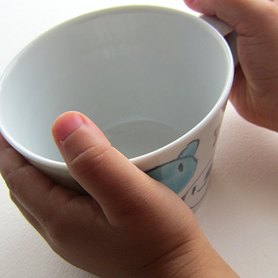 村田菜穂美さんの創る器シリーズ「クレパス みんなおともだち」のひとつのマグカップ。クレパスタッチで描かれた動物たちがとってもかわいい笑顔で笑っています。磁器ならではの丈夫さと滑らかな質感に、伝統工芸九谷焼の五彩「赤・黄・青(緑)・群青・紫」を使って描かれているから、かわいらしさにも落ち着きを感じる飽きのこないデザインに。子供が使うものだから、大きさ・重さ・安定感もしっかりと考えられてます。大人だってちょっと少なめに食べたいとき、飲みたい時にも、手軽に使えて、朝から夜の食卓で活躍しそう。ママが手で持って離乳食を食べさせる時にもハンドルは便利。