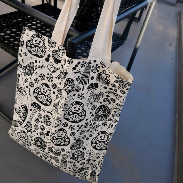 こちらはひゃくまんさんエコバッグ。モノトーンなので使いやすさ抜群。かわいいレトロっぽさがとってもおしゃれな仕上がり。とにかく軽くハンドルも長いので肩掛けもOKなのっが嬉しい!贅沢に全面にプリントされているので、最初はインクの匂いがしますが、使っていくうちにすっかり消えますのでご安心を♪